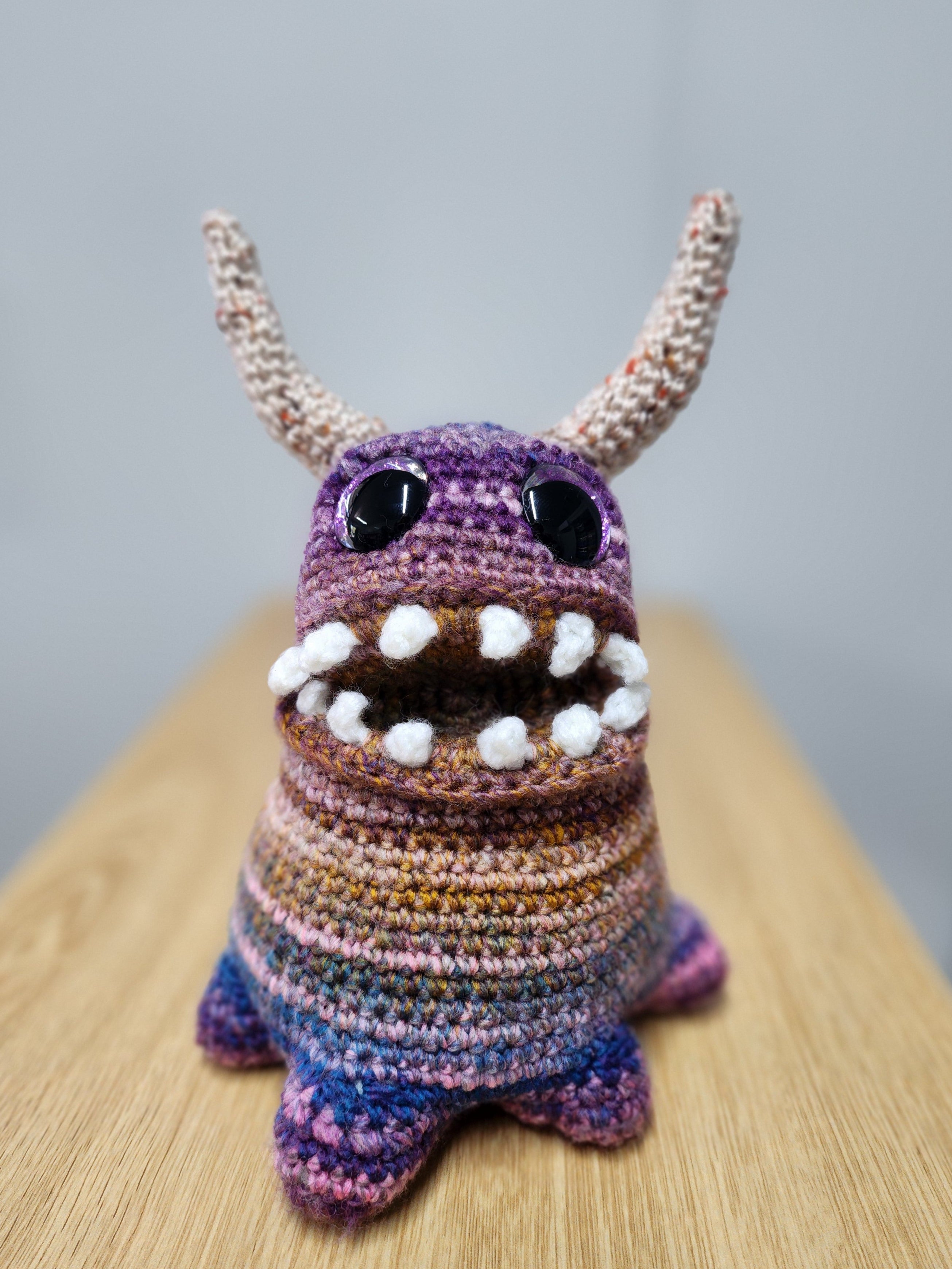 From Megan Lapp's book, Crochet Monsters. This monster was the blob monster pattern with open mouth and teeth. The variegated yarn gives the body more substance and depth.